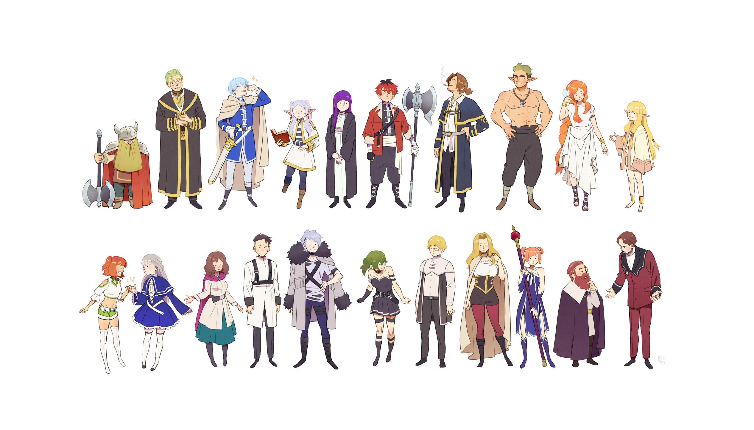 in 2023 i started a series of naruto drawings to see if i could still draw the characters from memory (i could), and it rapidly spun out of control until i was drawing as many characters as i could before my brain started dribbling out of my earsit was SO much fun that a few months later i did it with my other favourite manga, dungeon meshi, and found that i loved having a long-form project that i could chip away at when i felt like it, and that would build up into a monstrous canvas full of teeny little guys!